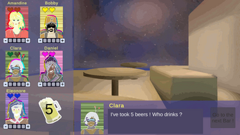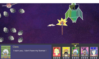 This is a very short game, about 5 minutes lifespan if you don't lose. It's a 2D space sidescroller where you just have to get to the end of the level without losing all of your HP (2HP per character, 5 characters). But beware of the effects of alcohol on the drivers !